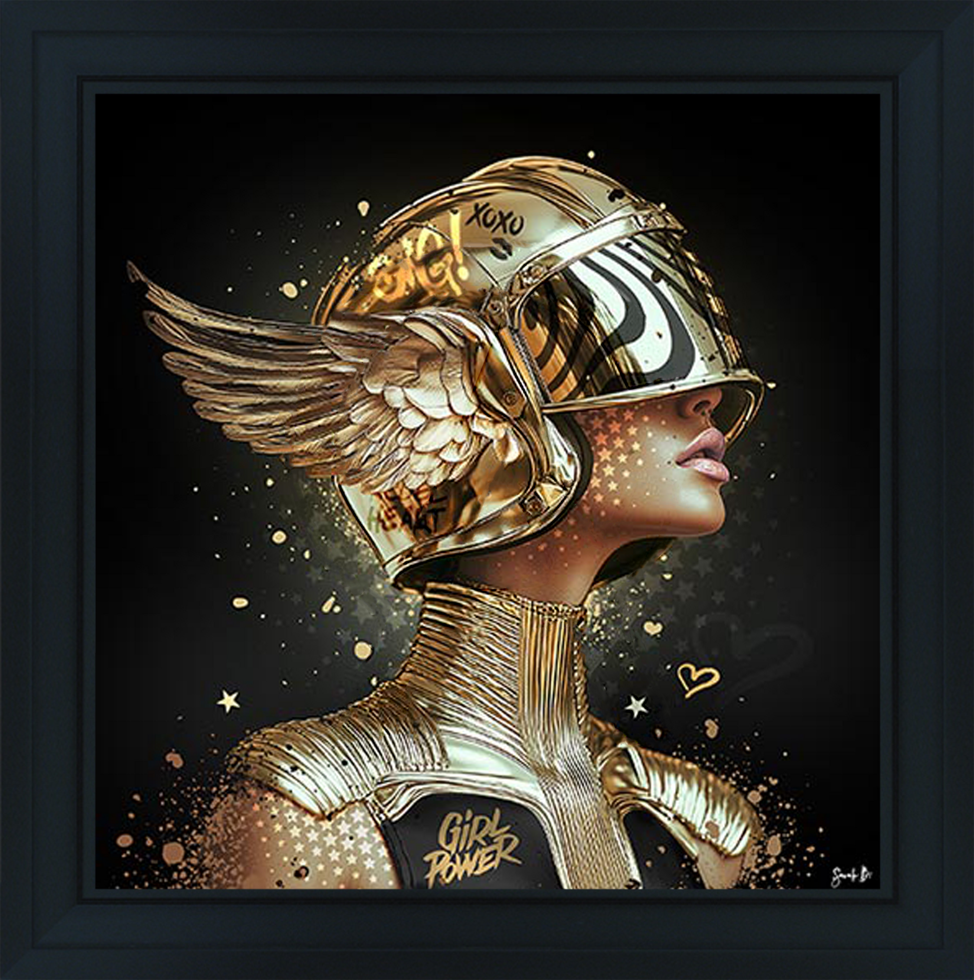 Experience the fusion of sci-fi and pop art with 'Gold Helmet' by Sarah B, a mesmerizing contemporary artwork that transforms the iconic Star Wars imagery into a luxurious modern masterpiece. This striking piece reimagines the classic Stormtrooper helmet in opulent gold tones, creating a sophisticated blend of pop culture and fine art. Expertly crafted with selective varnish and presented in a premium frame, making it a perfect statement piece for modern interiors. Each detail celebrates the intersection of geek culture and high art, creating an artwork that appeals to both Star Wars enthusiasts and contemporary art collectors. Perfect for those seeking to add a touch of cinematic elegance to their space while showcasing their appreciation for iconic film culture.
